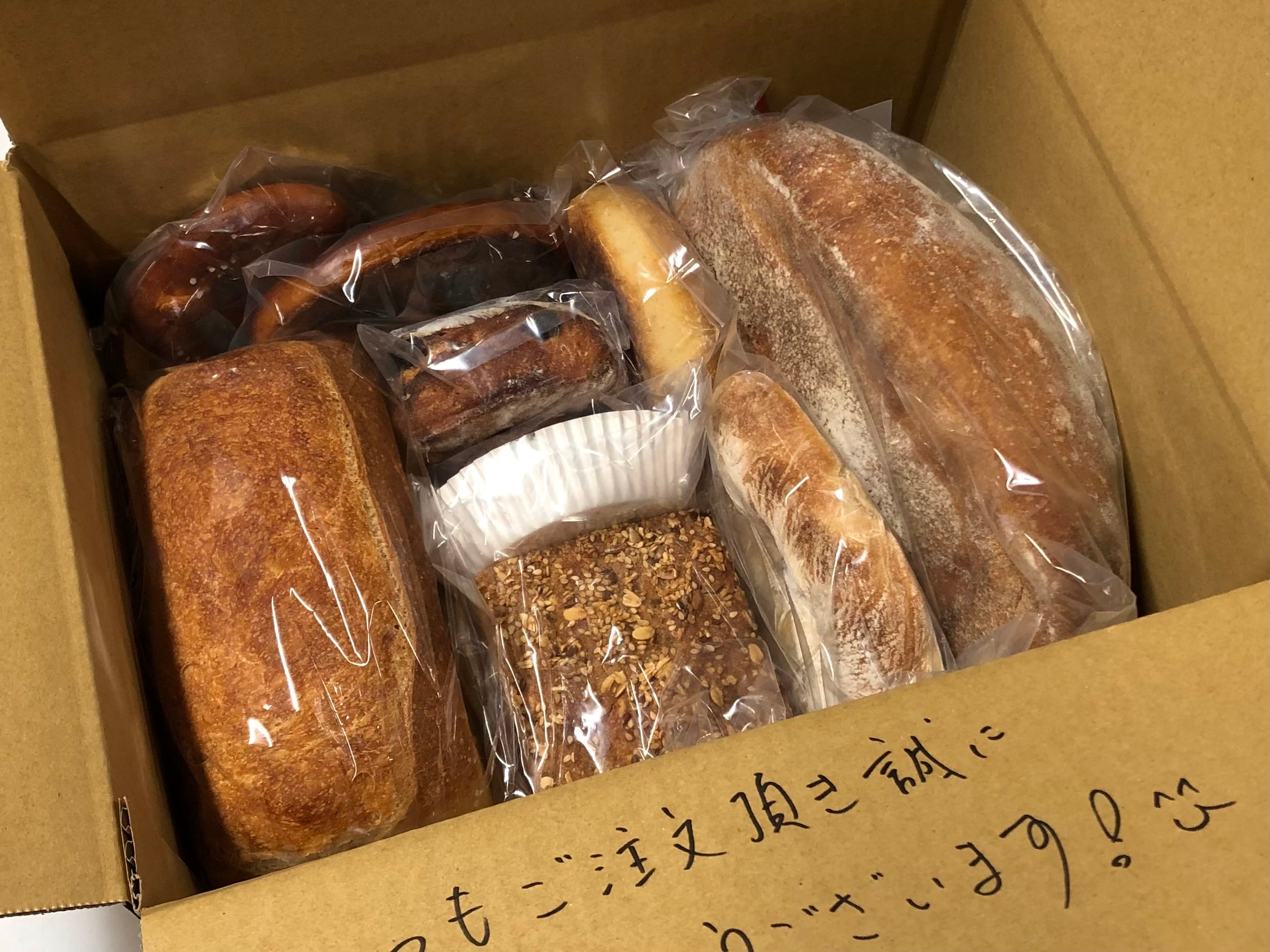 対してこちらの「おまかせ便」は店頭の開店前にパンを確保し、同じ種類が被ること無くたくさんの種類が入ります。発送日についても指定の日にちに計画的に行います